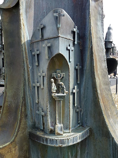 Im Jahr 2000 wurde der Bronzebrunnen von Bildhauer Klaus Apel (1927–2013) auf dem Kirchplatz von Heiligkreuz errichtet. Um die Geschichte des Stadtteils aufrechtzuerhalten, zeigt der Brunnen stilisierte Sehenswürdigkeiten, die die Geschichte von Heiligkreuz ausmachen. [1]