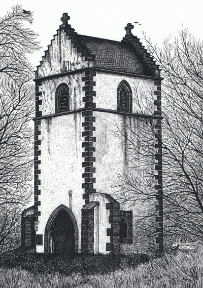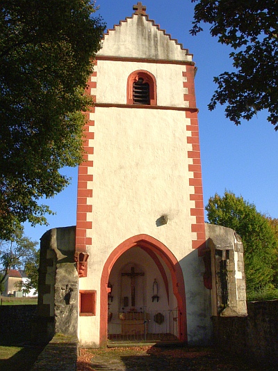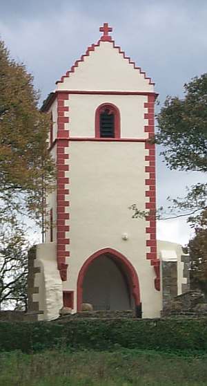 > Von der ehemals einschiffigen spätgotischen Kapelle ist nur der Glockenturm mit seinem treppenförmigen Giebel erhalten. Der Grundriß ist durch die Steinpflasterung und die bis zu geringer Höhe wieder aufgebauten Mauern sichtbar. Das Kirchenschiff wurde 1876/78 abgerissen.