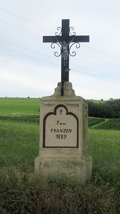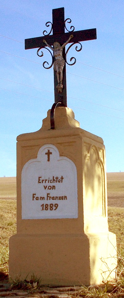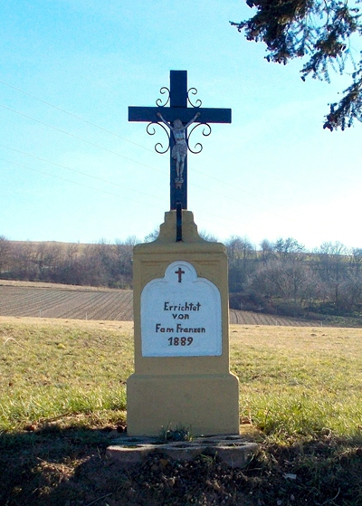 Neugotisches Pfeilerkreuz aus Sandsteinpfeiler mit Blenden und Steinkreuz mit Eisenkorpus. Das 1889 errichtete, zeittypische Kreuz ähnlich dem benachbarten und einem 1892 am Franzenheimer Bachtal gesetzten Wegekreuz. [1]
