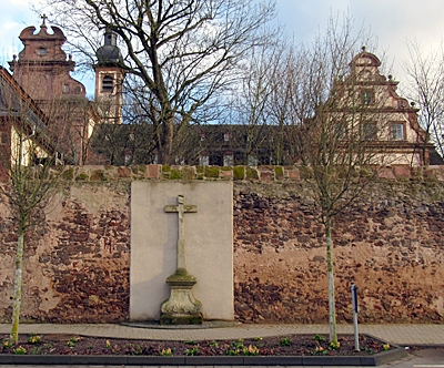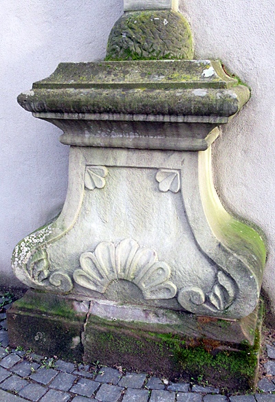Hochragendes Wegekreuz aus Sandstein, direkt an Ummauerung Kloster Karthaus angebracht. Korpus fehlend, Sockel mit Verzierungen. [1]