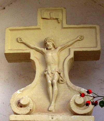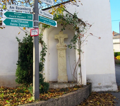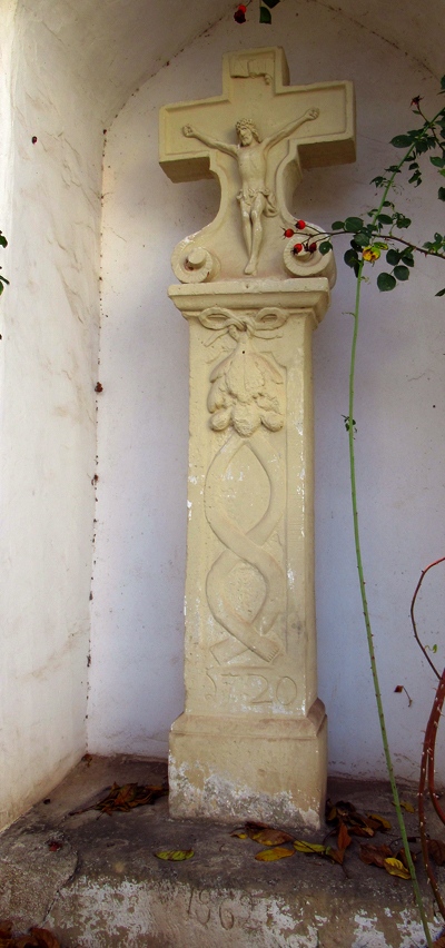 Mächtiges Schaftkreuz aus hellem Sandstein, mit Nische ummauert. Schaft mit Ornamenten verziert, Kreuzabschluß mit reliefiertem Korpus.