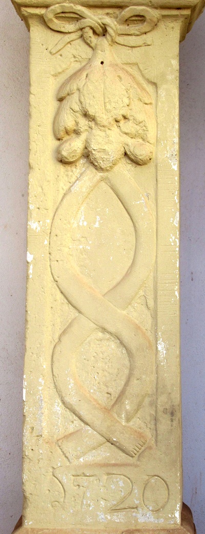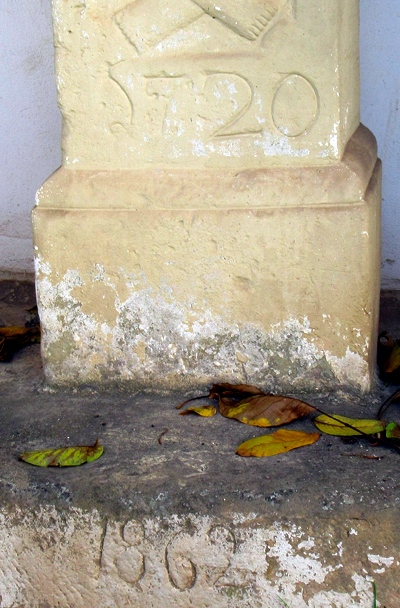 Am unteren Schaftansatz die Jahreszahl 1720, an Bodenplatte 1862 (Renovierung/Umsetzung?) eingemeisselt. [1]