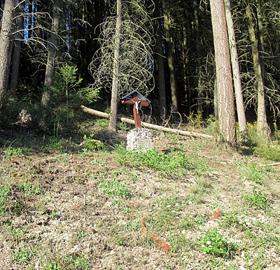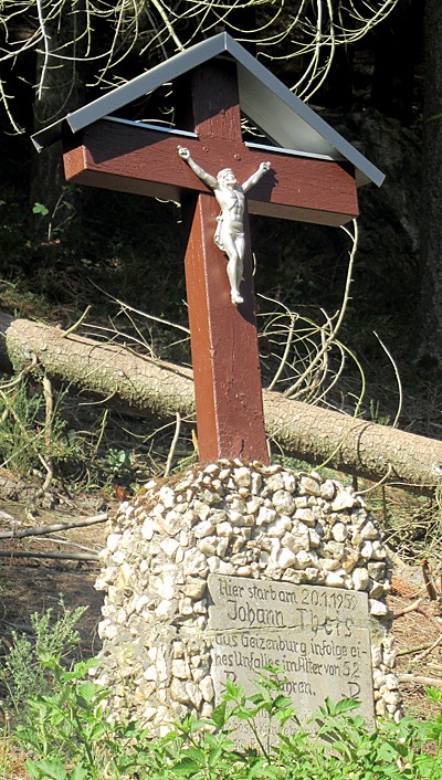 [...] An dieser Stelle wurde 1959 der 52-jährige Johann Theis aus Geizenburg bei Holzarbeiten von einem Baumstamm erschlagen. Aus demselben Baumstamm wurde später das Kreuz gefertigt und noch im selben Jahr aufgestellt. Der Sockel des Kreuzes ist mit kantigen Quarzsteinen ("Quarzschotter") besetzt. Die Inschrift auf der Sockelplatte lautet: