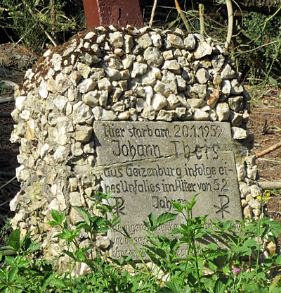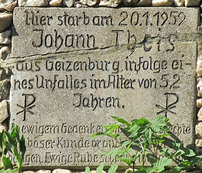 "Hier starb am 20.1.1959 / Johann Theis aus Geizenburg / infolge eines Unfalles / im Alter von 52 Jahren." Und darunter in verwitterter Schrift: