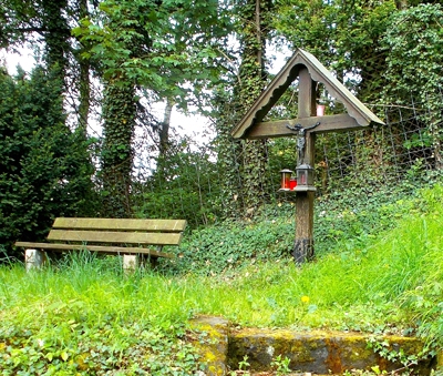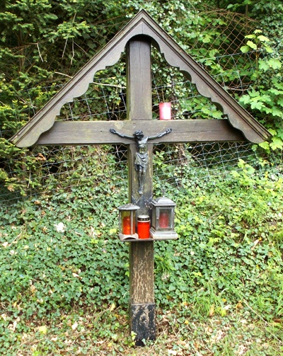 Holzkreuz mit gusseisernen Korpus, Rastbank daneben. [1]