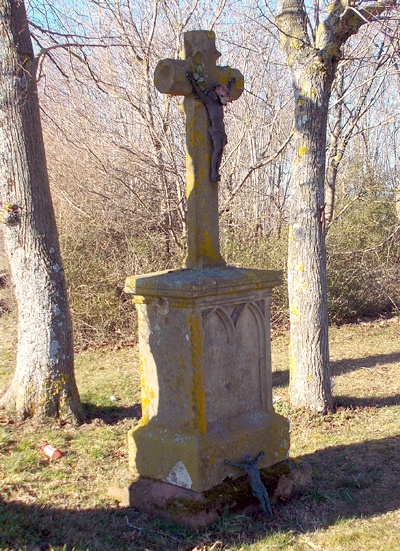 Der Pluwiger Schreiner Matthias Müller und seine Ehefrrau Anna Theisen haben das Kreuz hier 1855 aufgestellt. Die Inschrift des Kreuzes lautet: