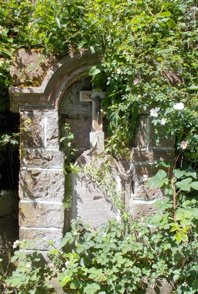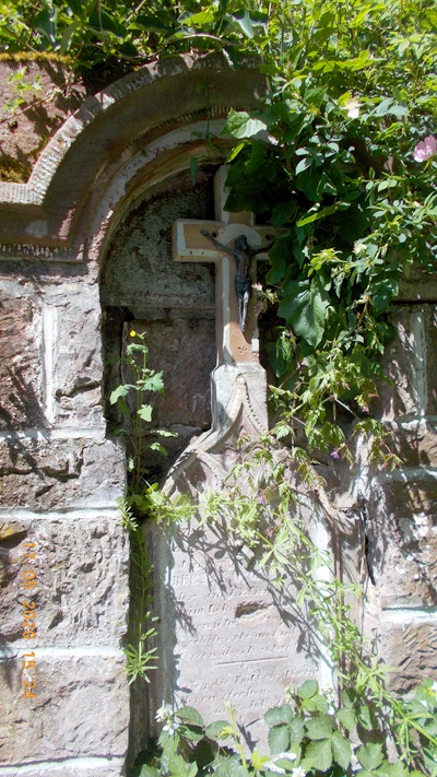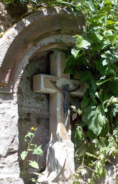 Steinernes Wegekreuz mit Korpus, direkt an K 37 gelegen, ummauert, teilw. zugewachsen, Inschrift am Sockel teils unleserlich. [1]