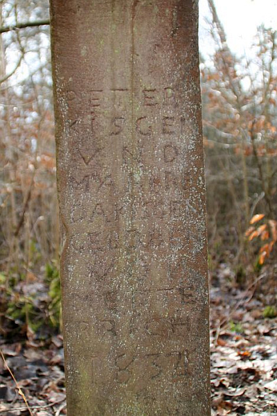 Der sich nach oben verjüngende Schaft nennt unterhalb einer Konsole als Stifter PETER KISGEN UND MARKREDA KISGEN GEBOREN VON METTERICH sowie die Jahreszahl 1834. [1]
