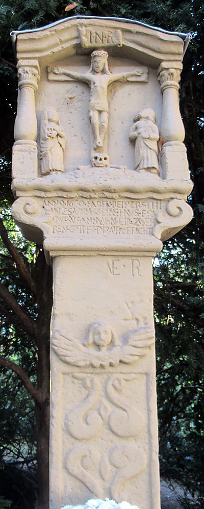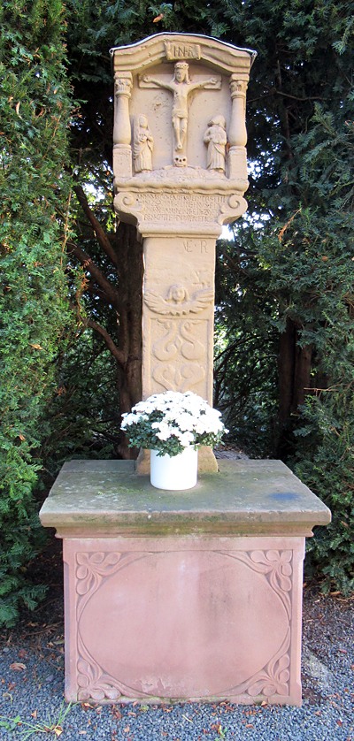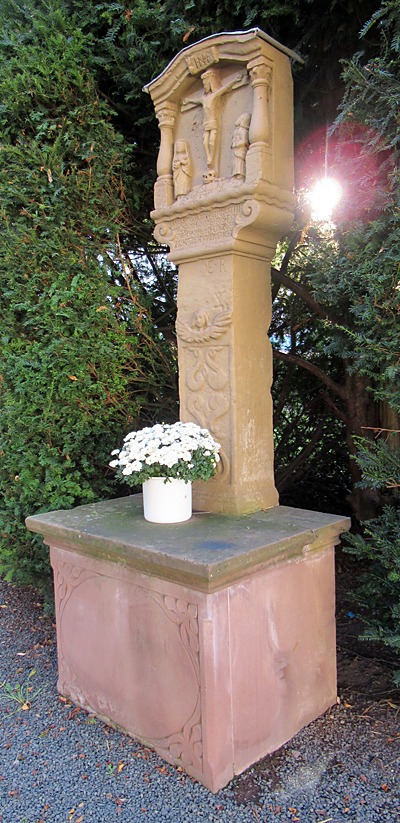 Altarkreuz in kleiner Grünanlage. Schaft mit Ornamenten verziert. Kreuzigungsrelief als Abschluß.