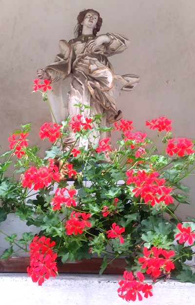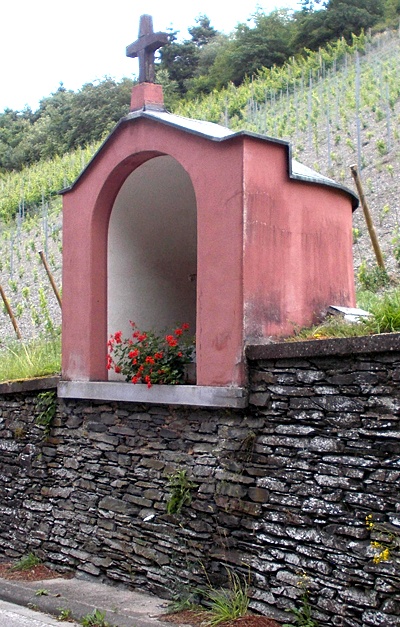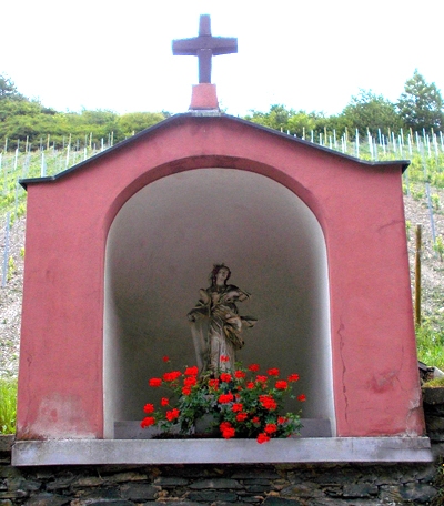 Auf Weinbergsbegrenzungsmauer errichtetes Heiligenhäuschen mit Heiligenfigur. [1]