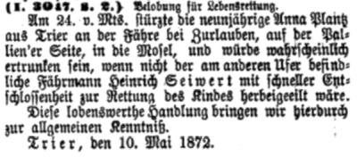 Heinrich Seiwert war noch 1879 Fährmann beim Fährpächter Gerhard Prim und wohnte mit diesem im Haus Nr. 88. Ab 1886 wird Johann Castor als Fährpächter geführt, der mit der Witwe Prim ebenfalls im Haus Nr. 88 wohnt.