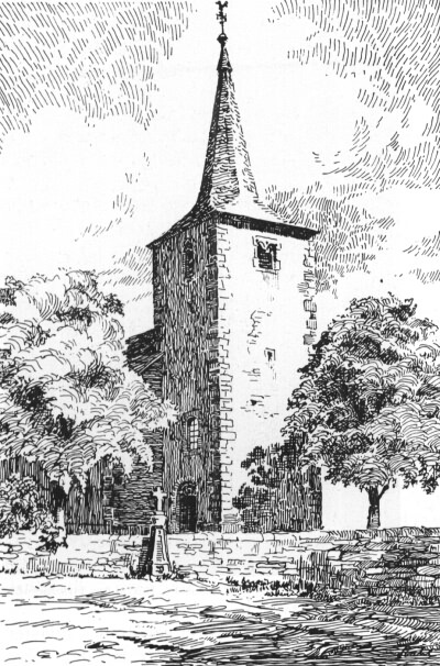 Westturm aus der zweiten Hälfte des 15. Jahrhundert, ursprünglich verteidigungsfähig, alter Eingang im ersten Obergeschoss. Schiff 1875. [1]