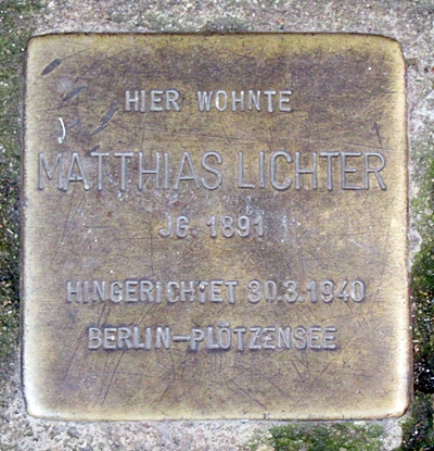 Plötzensee – das klingt idyllisch. Aber hinter dem harmlosen Ortsnamen verbirgt sich in der Nazi-Zeit ein berüchtigtes Gefängnis. Schlimmer noch: bis 1942 war Plötzensee "zentrale Hinrichtungsstätte" für die Menschen, die von den Blutrichtern des Volks- und Kammergerichts Berlin zum Tode verurteilt werden. Warum werden diese Frauen und Männer – es sind 2.891! – mit der Guillotine (Fallbeil) enthauptet? "Wegen Landesverrats", sagen die Nazis. "Landesverrat" ist es schon, wenn man sich trifft und Aktionen gegen die Regierung plant. So wie Menschen, die sich in Deutschland in dieser Zeit für eine kommunistische Gesellschaftsordnung einsetzen und die Hitler-Herrschaft bekämpfen. Zu ihnen zählt auch Matthias Lichter, der am 1.5.1891 als Sohn der Eheleute Matthias und Anna, geborene Weinand, in Butzweiler bei Trier zur Welt kommt. Dort leben sie in der Görgenmühle [heute: Kordel, Ortsteil Kimmlingen Red.], ab 1920 dann in Trier in der Nikolausstraße 1.