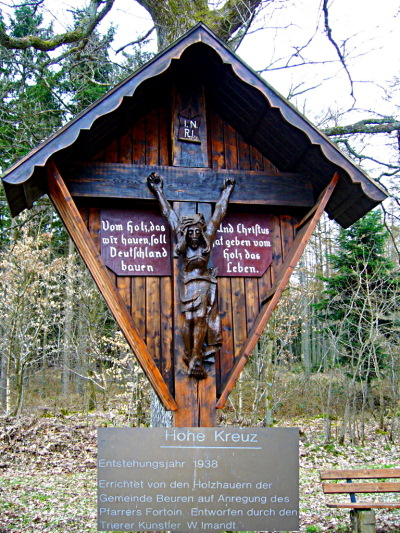Das circa 3,4 Meter hohe Holzkreuz befindet sich unter einem Schutzdach, das 1938 von den Holzhauern der Gemeinde Beuren aufgerichtet wurde. Der nicht lebensgroße Korpus ist eine ausdrucksstarke Arbeit des Trierer Künstlers W. Imandt. Seitlich an der Verschalung sind folgende originale Sinnsprüche zu lesen: