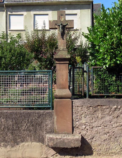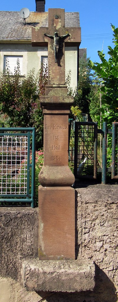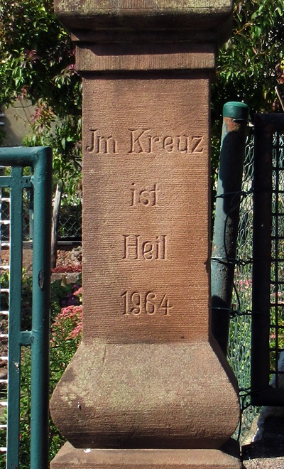 Schaftkreuz aus Sandstein, nachträglich in Grundstücksmauer eingefügt.