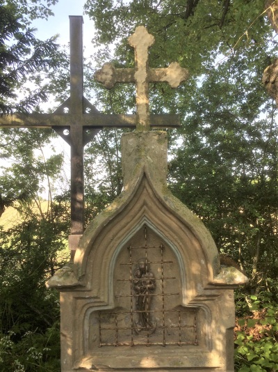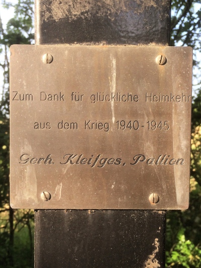 Hinter dem Palliener Kreuz. Plakette am Kreuz: