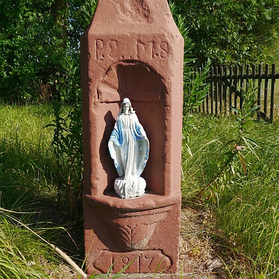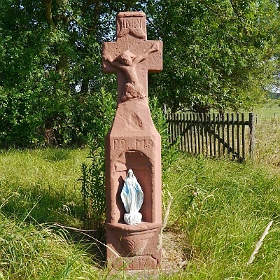 Am Ortsausgang nach Walsdorf steht rechts der Landessstraße ein Sandsteinkreuz mit Korpus, aus dem einem Herz aufsteigt. Am Schaft eine Nische mit Muschel. Die Initialen sind R.S. und M.S., sicherlich die Errichter. Am Fuß ist die Jahreszahl 1817 eingemeißelt. [1]