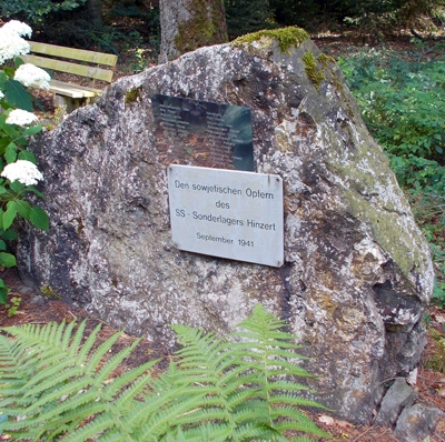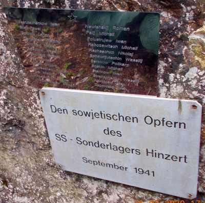 Im Herbst 1941 wurden in zwei LKWs aus dem Kriegsgefangenenen-Stammlager Baumholder ca. 70 sowjetische Gefangene auf geheime Anweisung aus Berlin in das SS-Sonderlager/KZ Hinzert transportiert. Für ihre Ermordung waren sie eigens aus der Kriegsgefangenschaft "entlassen" worden. Unter dem Vorwand der Impfung vor einem Arbeitseinsatz ermordete sie nachts der Lagerarzt, SS-Hauptsturmbannführer Dr. Wolter durch "Abspritzung" mit Zyankalilösung. Dies geschah im Beisein mehrerer ausgewählter SS-Angehöriger. Die Massengräber, ca. 200m nördlich von hier, wurden 1945 exhumiert.