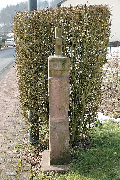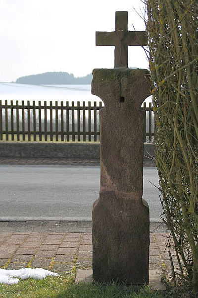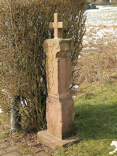 Niedriges, barockes Schaftkreuz, nach der teilweise unleserlichen Inschrift aus dem 18. Jahrhundert; neues Abschlusskreuz. Mit der charakteristischen Schaftverzierung aus drei übereinander hängenden Glockenblumenblüten schließt sich das Kreuz an eine Gruppe von ähnlichen Kreuzen im Raum Seffern Heilenbach an. [1]