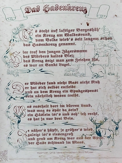 Holzkreuz mit kleinem gusseisernem Korpus. Daneben Infotafel mit Gedicht zum Hasenkreuz: