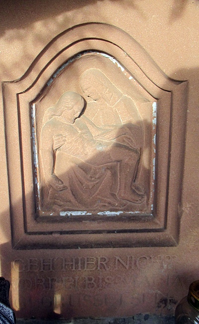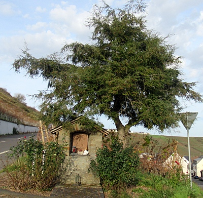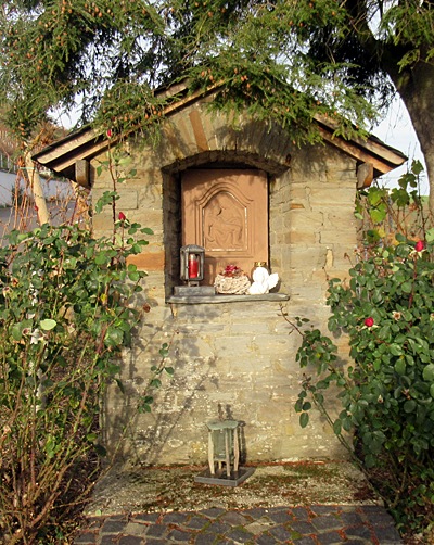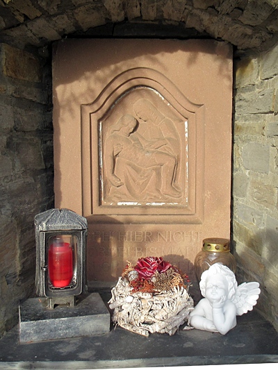 Heiligenhäuschen aus Moselschieferbruchstein, mit Giebel und Nische. Im Inneren der Nische Relief mit Pietà. [1]
