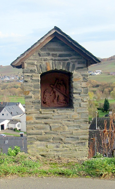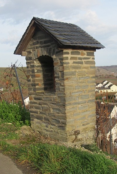 Heiligenhäuschen aus Moselschieferbruchstein, mit Giebel und Nische. Im Inneren der Nische Relief einer Kreuzwegstation (Veronika reicht Jesus das Schweißtuch). [1]