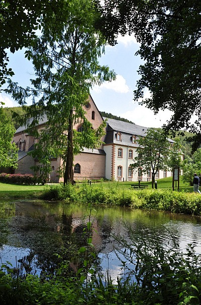 Um 1185 gründeten Ludwig von Deudesfeld und seine Frau Ida das Kloster Sankt Thomas als Zisterzienser-Frauenabtei. Sie war die erste in Deutschland. Da viele adelige Frauen aus dem Eifel-, Hunsrück-, Mosel- und Rheingebiet ins Kloster eintraten, lag es nahe, dass ihre Familien zum Bau und zur Erhaltung von Kloster und Kirche beitrugen. Die Zisterzienserinnen übernahmen die alte Kapelle, die von den Waldschwestern erbaut worden war. Sie musste 1881 wegen Baufälligkeit abgerissen werden. Schon bald nach dem Bau des Klosters wurde auch die jetzige Kirche errichtet. Die Kirche, 1222 eingeweiht, spätromanisch, ist eine typische mittelalterliche Zisterzienserinnenkirche: Lage in einem Wiesental, fließendes Wasser, Langschiff, Westfassade mit großer Rosette, kein Kirchturm, nur Dachreiter. Die Nonnenempore erstreckt sich über die Hälfte des Langschiffs und ist vom Kloster aus zugänglich. Das gesamte Langschiff ist Gräberfeld. Es diente als Beerdigungsstätte der Klosterfrauen, vor allem der Äbtissinnen und Priorinnen sowie von Wohltätern des Klosters. Die Grabplatten, als Flachrelief gestaltet, wurden nach Zisterzienserrat bündig mit dem Boden verlegt. Die besterhaltenen sind unter der Empore zusammengelegt, andere stehen im übrigen Kirchenraum. Gerne zitieren wir an dieser Stelle den bekannten Kunsthistoriker Dehio, denn besser als er kann man die Einschätzung der Abteikirche Sankt Thomas nicht zusammenfassen: Die bekannte Einfachheit der zisterzienserischen Formensprache nimmt hier die Charakternuance des Rauen und Trotzigen an. Wie sie dabei immer künstlerisch bleibt, dafür ist Sankt Thomas ein ausgezeichnetes Beispiel. Nur Zisterzienser vermochten einem verhältnismäßig so kleinen Gebäude soviel Zwingendes, soviel Ernst und Wucht zu geben.