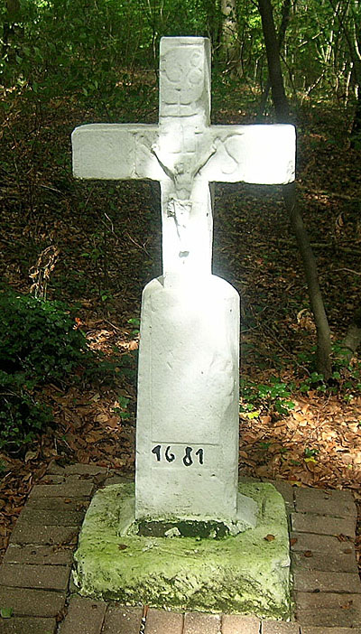 Wegekreuz mit Korpus, bezeichnet 1681, IHS am Querbalken. [1]