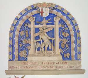 Der Hauptblickpunkt im sakralen Innenraum ist das Relief Christus in der Kelter, eine Nachbildung des gleichen Motivs in der Kreuzkapelle zu Ediger an der Untermosel. Die ausdrucksstarke sakrale Plastik ist ein Beweis dafür, wie sehr der Gedanke an den Weinbau auch Eingang gefunden hat in den kirchlichen Bereich. [1]