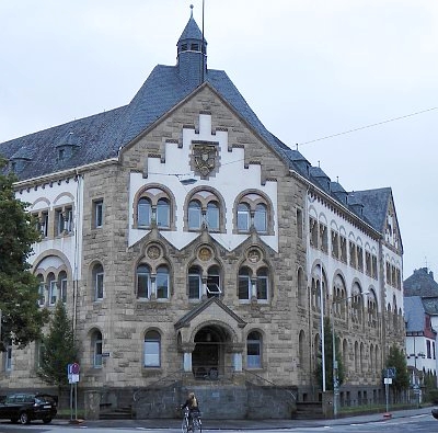 1903-05 als preußische Katasterverwaltung von Landesbauinspektor Jaffke erbaut. Winkelförmiger dreigeschossiger Bau in spätromanischen Formen. Die Straßenflügel mit den Veraltungsräumen verbunden durch einen bogenförmigen Archivtrakt im Hof. Durch Abschrägung die Ecke mit Giebel und offener Vorhalle ausgebildet, an den Flügelenden übergiebelte Risalite. Die Fassaden mit aufwendigen Fenstergruppen geprägt von der differenzierten Oberflächenbehandlung der Sandsteinverkleidung. Im Innern Rippengewölbte Eingangshalle. [1]