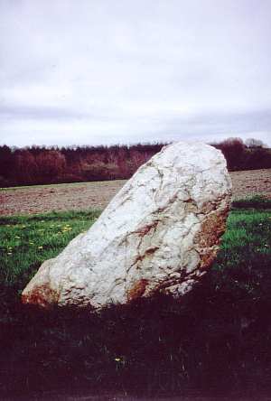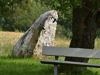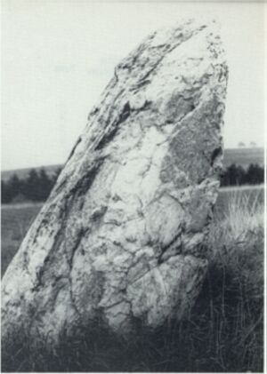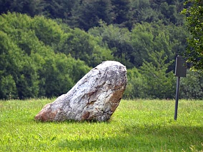 Weißer Hunsrückquarzit, von unseren Vorfahren vor 4 - S Jahrtausenden hierher gebracht und aufgerichtet. Ältestes Zeugnis der Besiedlung unserer Heimat. Versammlungsort zur Ausführung eines religiösen Kultes oder Teil einer Anlage für astronomische Beobachtungen, zur Erkennung
