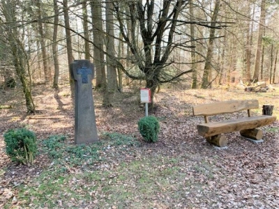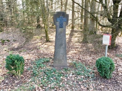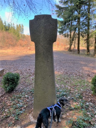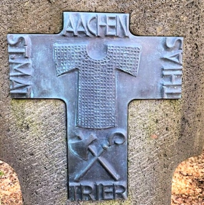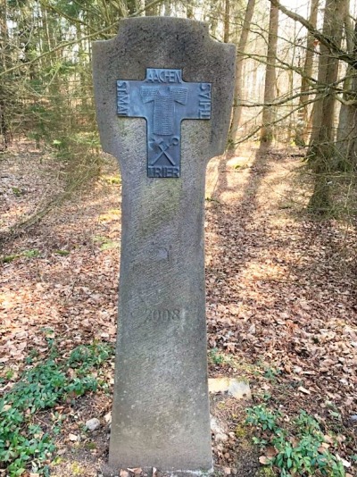 Schaftkreuz aus Basalt mit eingearbeitetem Bronzekreuz. Entwurf von Theo Schrennen (Köln), gefertigt in der Standbildhauerei Anno Walk (Köln), eingesegnet am 29.4.2008. Aufgestellt von der Wallfahrtsgruppe "Wanderexerzitien der Diözese Aachen" aus Anlass der 50. Fußwallfahrt. [1]