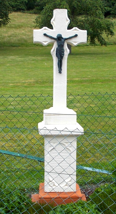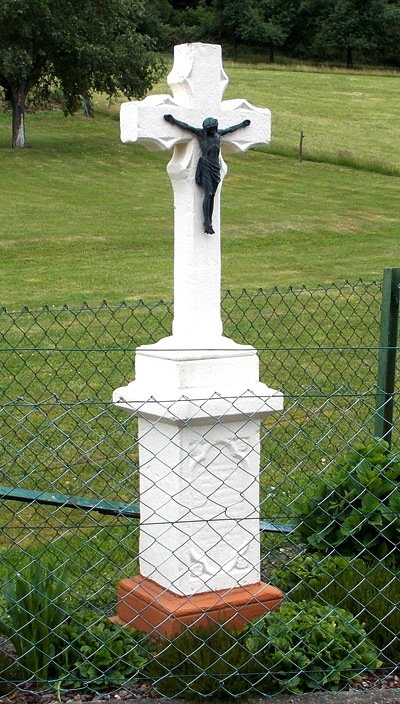 Steinernes Schaftkreuz mit gusseisernem Korpus, frischer Anstrich. Inschrift am Sockel nicht mehr lesbar. [1]