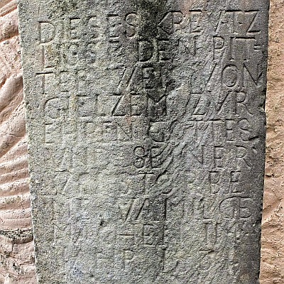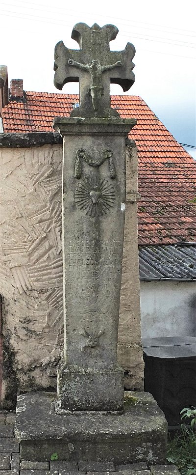 Neben dem Eingang zum Kirchhof steht ein aus einem Stück Luxemburger Sandstein gefertigtes Schaftkreuz. Es wurde 1831 von PITTER WEIS für die Verstorbenen seiner Familie gestiftet. Der nach oben anschwellende Schaft trägt über einem Totenkopf die Inschrift. Darüber ein von Strahlen umgebenes Herz Jesu und ein Feston. Der Korpus des Abschlußkruzifix mit doppelt gespaltenen Enden hat seinen Kopf verloren. [1]