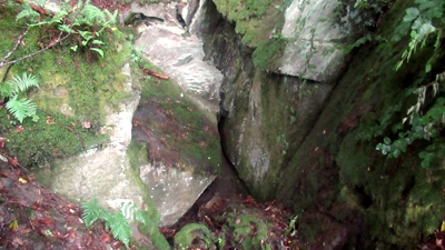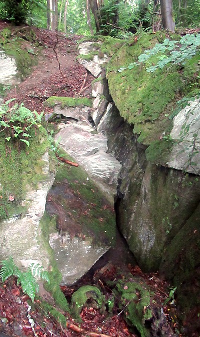 Mittlerweile verbrochenes Mundloch der Grube Mertesnaf, dahinter die Halde mit dem angefallenen Schieferabraum.