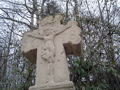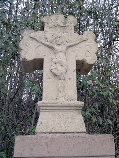Beschreibung: Schaftkreuz 2,82m hoch. Sockelfuß mit profiliertem Abschluß, auf dem ein rechteckiger mehrfach gegliederter Schaft mit gerollter Schriftplatte sitzt, das direkt unterhalb eines einfachen Kapitells platziert ist. Als Bekrönung trägt das Wegmal auf einem profiliertem Kreuzfuss ein Kreuz mit doppelt gekerbten, runden Enden und einem im Flachrelief herausgearbeiteten, steinernen Korpus mit eingemeißelter Jahreszahl 1678 unterhalb der ausgestreckten Arme.