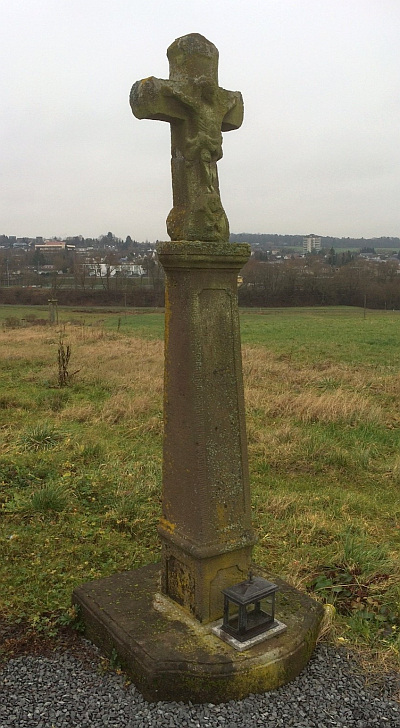 Der in einem geschwungenen, profilierten Einlaßstein stehende, nach oben zusammenlaufende Schaft nennt als Stifter CHRISTOFEL und MARGARETHA PRIAM VON MIETZ (= Mötsch) und das Aufstellungsjahr 1778. Das große, einmal gebrochene Abschlußkreuz mit plastischem Korpus schwingt an den Balkenenden leicht aus.