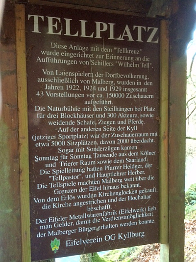 Diese Anlage mit de "Tellkreuz"wurde eingerichtet zur Erinnerung an die Afführungen von Schillers "Wilhelm Tell". Von Laienspielern der Dorfbevölkerung, ausschließlich von Malberg, wurden in den Jahren 1922, 1924 und 1929 insgesamt 43 Vorstellungen vor ca. 150.000 Zuschauern aufgeführt.