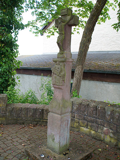 Über der Jahreszahl eine reliefartige Pietà unter schlichtem Kapitell. Den Abschluß bildet ein hohes aufgesetztes Kreuz. Dieser und der Corpus sind saubere Steinmetzarbeiten. Die Höhe beträgt etwa 2.20 m. Es Steht heute auf einem Betonsockel. Vorher war es tief in der Erde eingelassen. [1]