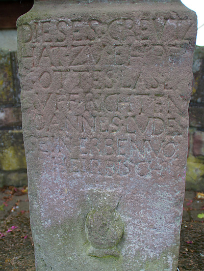 Darunter ist ein Krug ausgehauen, der auf das Töpferhandwerk hinweist. Im Kreuzmittelteil ein typisch bauchiges barockes Zwischenstück mit Verzierungen. Auf dem Zwischenstück stehen die Buchstaben und die Jahreszahl der Errichtung: