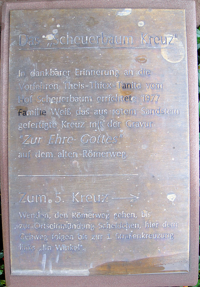 In dankbarer Erinnerung an die Vorfahren Theis-Thiex-Tanita vom Hof Scheuerbaum errichtete 1977 Familie Weiß das aus rotem Sandstein gefertigte Kreuz mit der Gravur "Zur Ehre Gottes" auf dem alten Römerweg.