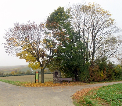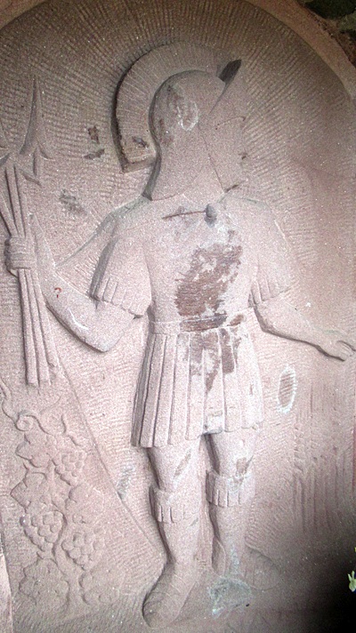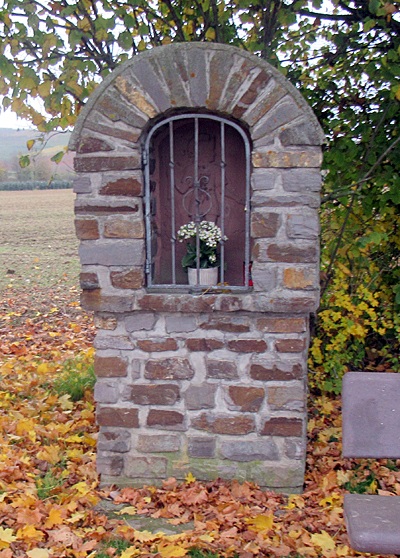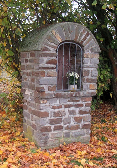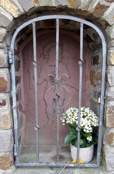 Nischenbildstock aus Bruchstein, Nische vergittert. In der Nische Reliefbild des Hl. Donatus.