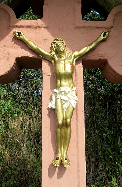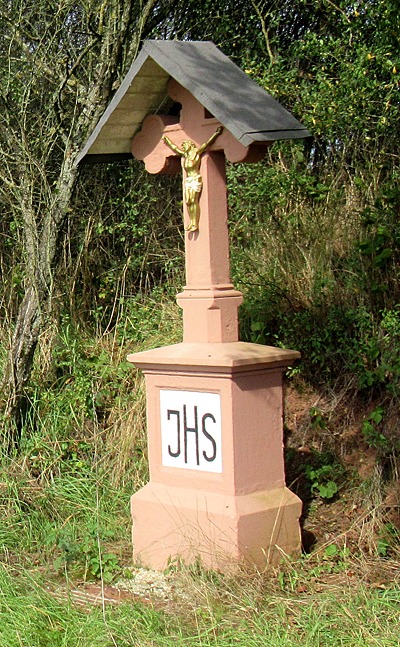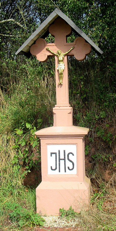 Pfeilerschaftkreuz aus Sandstein, renoviert. Abschluß bildet ein Kleeblattkreuz mit eisernem Korpus, darüber Schutzdach.