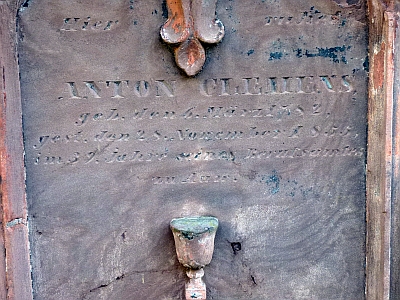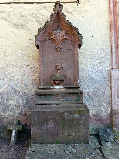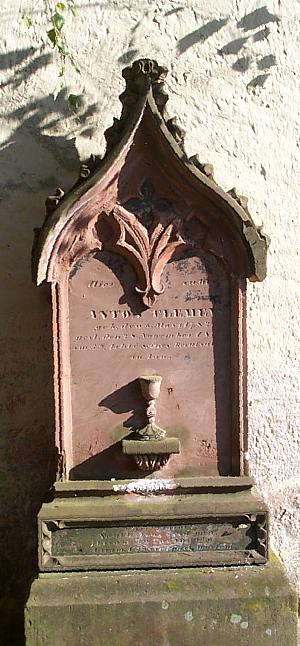 (Frommer Wanderer, erschrick nicht vor meinem Gebein. Im Leben war ich wie du; was ich jetzt bin, wirst du nach dem Tode auch sein.) Darauf der spitzauslaufende neugotische Grabstein, verziert mit Blumen- und Blattornamenten, die ausgehauen sind. Er schließt ab mit einer mit Zacken versehenen dachartigen Leiste. Der Grabstein ist mit einer noch gut lesbaren Inschrift bedeckt: