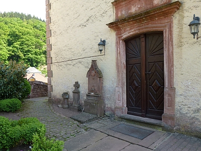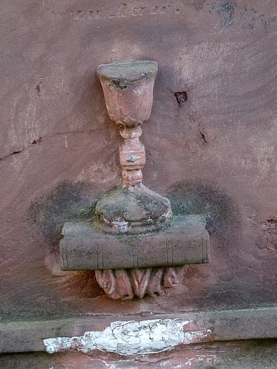Vor dem Eingang zur Auwer Pfarrkirche steht dieses kunstvolle Denkmal. Es ist der Grabstein des weithin bekannten Auwer Här. Auf dem schweren Schaft liegt eine Sandsteinplatte, die an den Seiten mit Blattwerk verziert ist und auf der die heute nicht mehr gut lesbare lateinische Inschrift steht:
