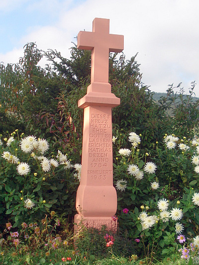Etwa 300 m vom Ortsrand von Kröv steht dieses neue Schaftkreuz aus rotem Sandstein gefertigt, an der Straße nach Kinheim. Es steht für ein altes Kreuz aus dem Jahre 1764, wie aus der Inschrift zu ersehen ist. Der Sockel- stein schaut nur wenig über dem Boden hervor. Breiter Schaftfuß. Der Schaft unten bauchig erweitert ohne weitere Zierform. Inschrift: