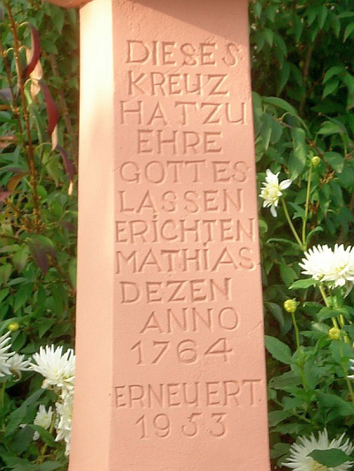 Kapitell einfach gehalten. Das Abschlußkreuz mit eisernem Corpus. – der unterste Teil bis zum halben Schaft ist noch der alte Stein, der aber gänzlich an der Oberfläche abgemeißelt ist. Kreuz in guten Zustand. Höhe 2,20 m.