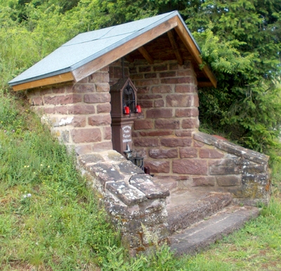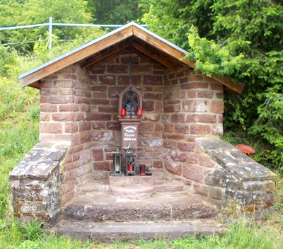 Kleine Kapelle aus Rotsandsteinquadern, unverputzt.