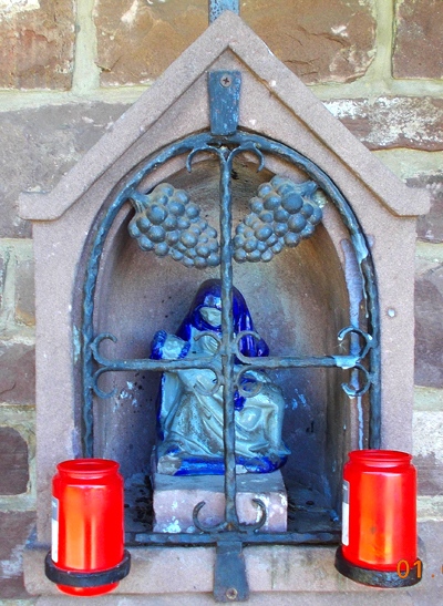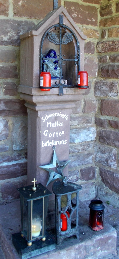In der Mitte steinernes Schaftkreuz mit Nische, darin enthalten eine kleine Keramik-Pietà.