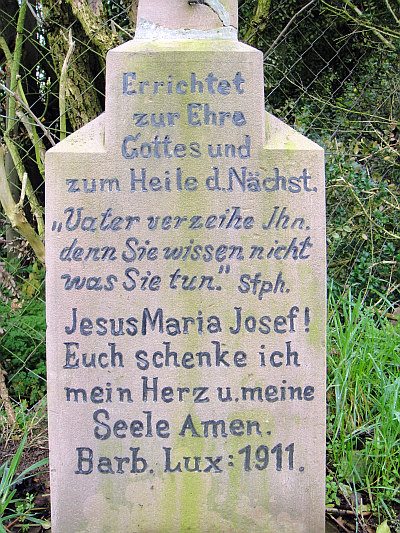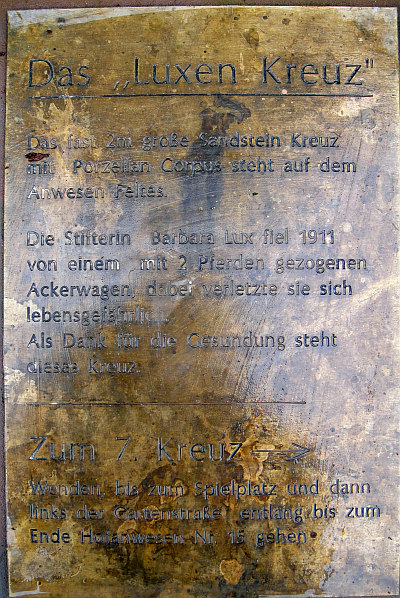 Das fast 2m große Sandstein Kreuz mit Porzellan Corpus steht auf dem Anwesen Feltes.